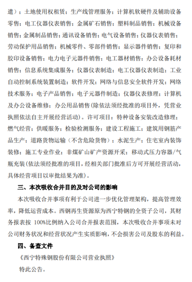 從《公告》中獲悉,西寧特殊鋼股份有限公司于2024年12月13日召開第十屆董事會第十次會議、2024年12月31日召開2024年第五次臨時股東大會審議表決通過了《關于公司吸收合并全資子公司青海西鋼再生資源綜合利用開發(fā)有限公司的議案》,由西寧特鋼以吸收合并的方式注銷青海西鋼再生資源綜合利用開發(fā)有限公司,合并完成后,西鋼再生資源法人資格注銷,全部資產、負債、權益、業(yè)務、職工等由西寧特鋼承繼。