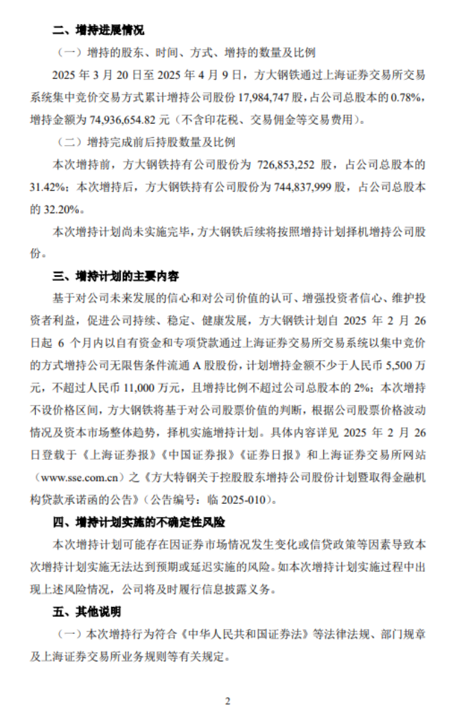 從《公告》中獲悉,控股股東方大鋼鐵于2025年3月20日至2025年4月9日,通過集中競價交易方式增持公司股份1798萬股,占公司總股本的0.78%,增持金額為7494萬元,增持金額已達到并超過本次增持計劃擬增持金額的區(qū)間下限,增持計劃尚未實施完畢。