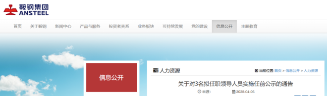 近日,鞍鋼集團官網發布了《關于對3名擬任職領導人員實施任前公示的通告》。