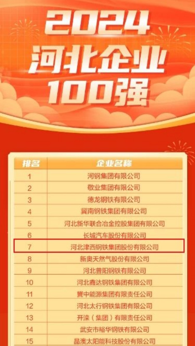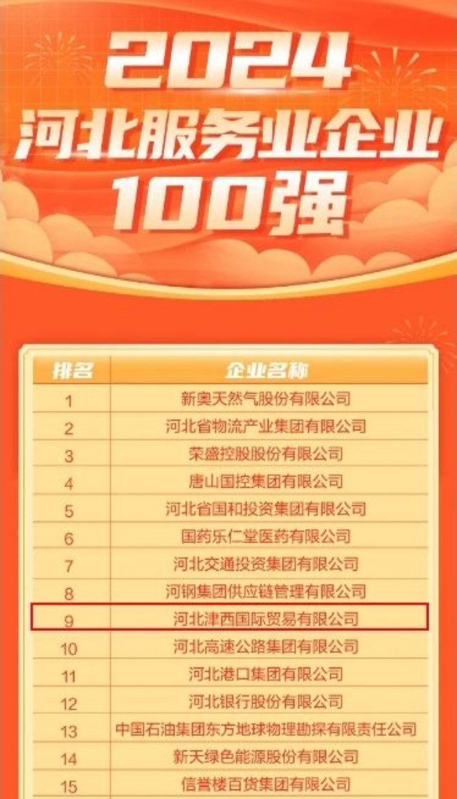 近日,河北省企業聯合會發布了2024河北企業100強、制造業企業100強、服務業企業100強和創新領先50強名單。津西集團子公司津西股份、津西國貿分別上榜2024河北企業100強、制造業企業100強和服務業企業100強。