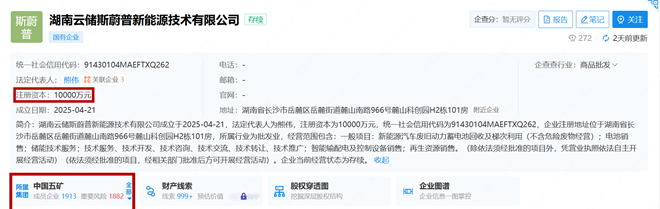 企查查信息顯示,4月21日,湖南云儲斯蔚普新能源技術有限公司成立,該公司位于湖南省長沙市,法定代表人為熊偉,注冊資本1億人民幣。