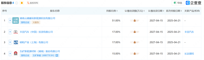 該公司由中國五礦旗下湖南云儲循環新能源科技有限公司、五礦新能源材料(湖南)股份有限公司、豐田汽車(中國)投資有限公司、明和產業(上海)有限公司共同持股。