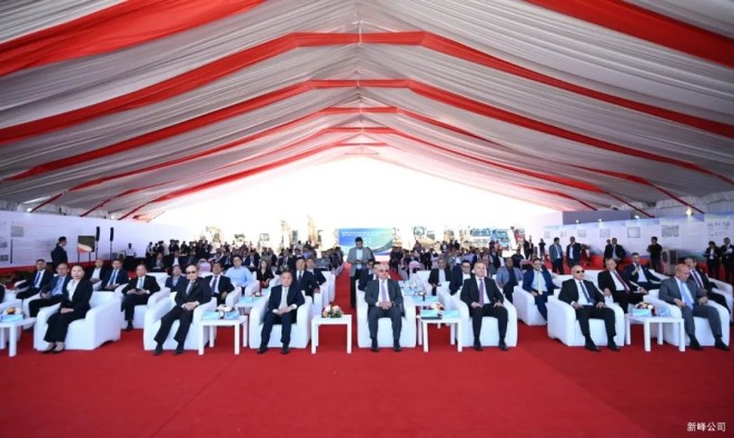 新峰集團董事長田海奎、黨委書記郝桂茹、中國駐埃及大使館經商處趙劉慶公參、蘇伊士運河經濟區管理總局主席瓦利德、中國天辰工程有限公司總經理梁軍湘和中鋼設備有限公司副總經理唐發啟等向奠基石揮鍬培土,標志著新峰(埃及)裝備及鋼鐵制造中心建設正式開工。