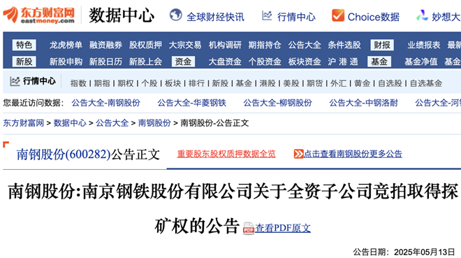 5月13日,南鋼股份發布公告稱,5月12日,該公司全資子公司安徽金安礦業有限公司(以下簡稱“金安礦業”)以92,036.77萬元人民幣競得安徽省霍邱縣范橋鐵礦勘探(探礦權保留)探礦權;同日,金安礦業與安徽省產權交易中心有限責任公司簽訂《競價結果通知單》。