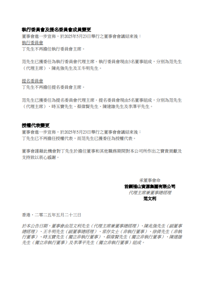 5月23日,首鋼福山資源集團有限公司發布了《執行董事退任、董事會主席變更、董事委員會成員變更及授權代表變更》公告。