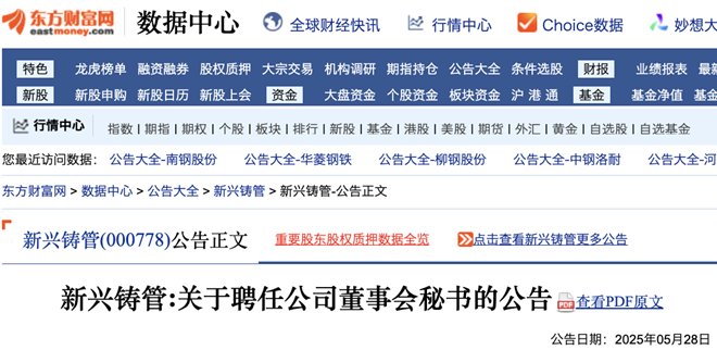 5月28日,新興鑄管股份有限公司(以下簡稱“該公司”)發(fā)布《新興鑄管股份有限公司關(guān)于聘任公司董事會秘書的公告》(以下簡稱《公告》)。