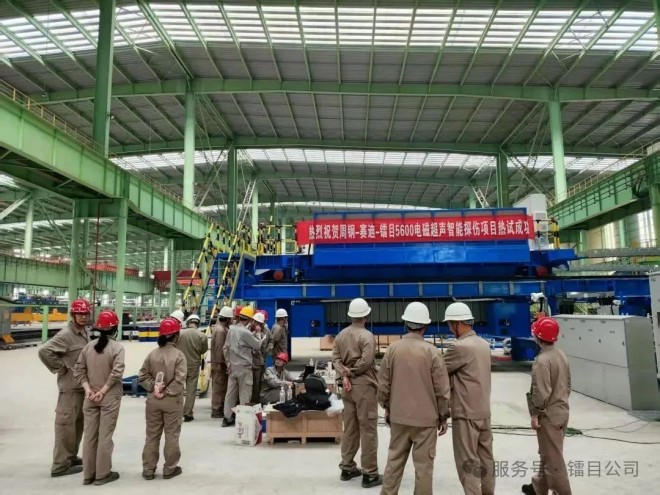 2025年5月20日,鐳目公司自主研發的電磁超聲中厚板智能探傷系統于河南安鋼周口鋼鐵有限責任公司(周鋼)的全球最寬5600毫米寬厚板生產線成功完成熱試,創造了全板面“零漏檢、全準報”的卓越成績,刷新了行業紀錄,填補了國際技術空白。