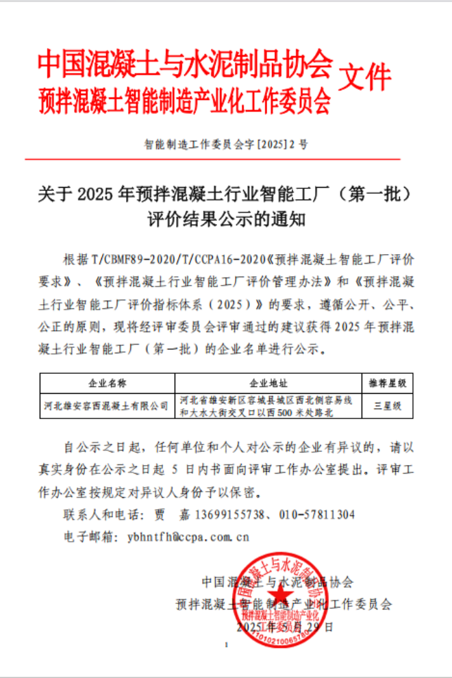 近日,中國二十二冶雄安容西混凝土攪拌站獲評中國混凝土與水泥制品協會預拌混凝土智能制造產業化工作委員會授予的"預拌混凝土行業三星級智能工廠"稱號。該榮譽系預拌混凝土行業智能化評估的最高等級認證,標志著雄安容西攪拌站成為2025年度全國首個通過此項權威認證的企業。截至目前,全國范圍內僅有3家企業成功獲評該頂級智能工廠認證。