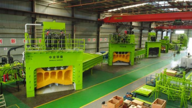 崇中環保此次一次性采購了中金裝備打包、剪切、破碎一整套大型廢鋼處理裝備,包括:全球首創的2000噸多主缸專利打包機,1250噸階梯式專利多刀龍門剪,以及630kW推料破碎機。