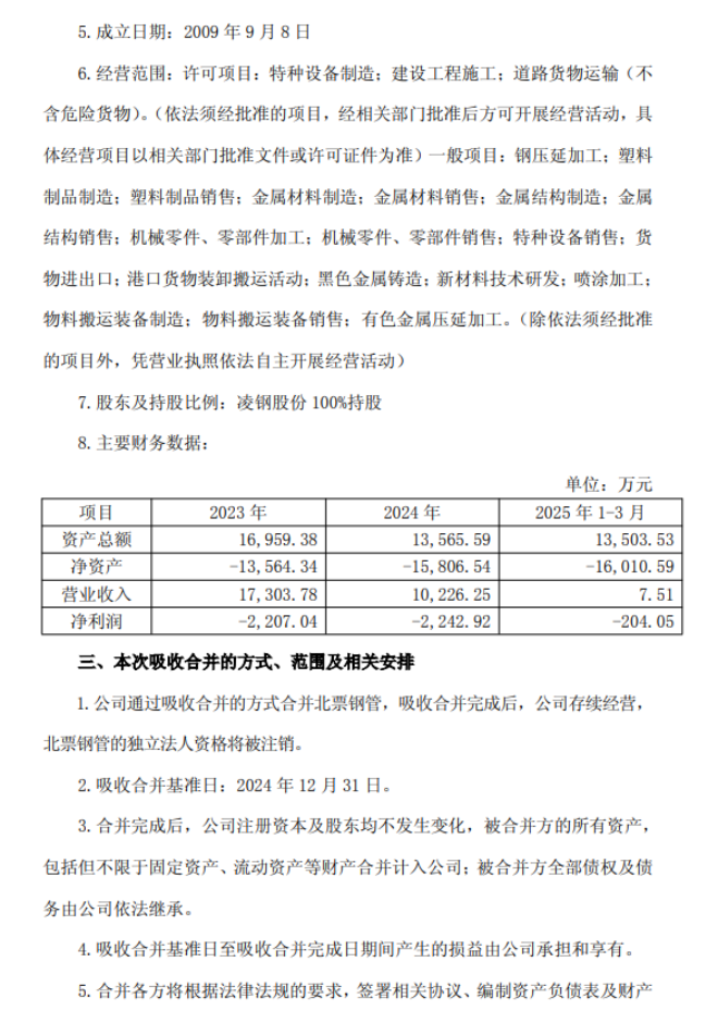 從《公告》中獲悉,為進一步提高凌源鋼鐵股份有限公司(以下簡稱公司或本公司)管理效率,降低運營成本,減少虧損企業戶數,經對凌鋼股份北票鋼管有限公司(以下簡稱北票鋼管)歷史沿革、經營情況及發展前景分析研判,擬由本公司吸收合并方式,實現北票鋼管退出。吸收合并完成后,北票鋼管的獨立法人資格將被注銷,北票鋼管全部資產、負債、業務和人員等均由本公司承繼。