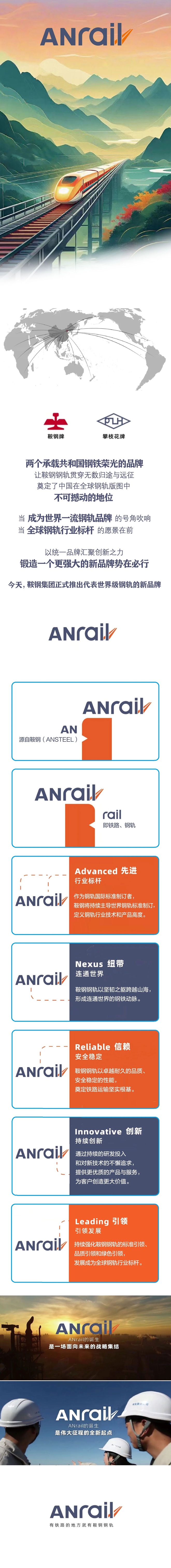 鞍鋼鋼軌品牌ANrail是鞍鋼集團(tuán)錨定“打造享譽(yù)世界的鋼軌品牌”目標(biāo),整合旗下“鞍鋼”“攀枝花”兩大鋼軌品牌數(shù)十年淬煉的研發(fā)生產(chǎn)實(shí)力、全球資源和市場(chǎng)聲譽(yù)而創(chuàng)建的鞍鋼鋼軌統(tǒng)一品牌。“ANrail”中的“AN”取自鞍鋼英文名稱ANSTEEL,“rail”代表鋼軌,字母A、N、R、I、L分別代表Advanced(行業(yè)標(biāo)桿)、Nexus(連通世界)、Reliable(值得信賴)、Innovative(持續(xù)創(chuàng)新)、Leading(引領(lǐng)發(fā)展)。