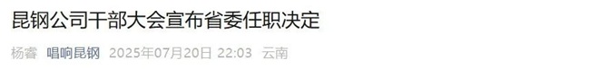 從唱響昆鋼微信公眾號獲悉,7月20日下午,云南省委組織部在昆鋼公司召開干部大會,云南省委組織部部務(wù)委員胡波宣讀省委對昆鋼干部的任職決定并提出工作要求。云南省國資委黨委副書記劉成志主持會議。