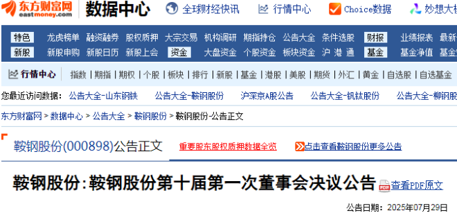 公告內(nèi)容顯示,鞍鋼股份有限公司(以下簡稱公司)于2025 年7月28日在公司會(huì)議室召開第十屆第一次董事會(huì)。會(huì)上,公司審議并通過了《關(guān)于選舉公司第十屆董事會(huì)董事長的議案》,選舉王軍先生為公司第十屆董事會(huì)董事長。