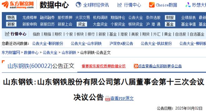 8月2日,山東鋼鐵股份有限公司發(fā)布了第八屆董事會(huì)第十三次會(huì)議決議公告。