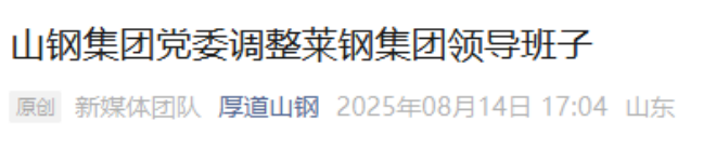 8月14日,山鋼微信公眾號發布了《山鋼集團黨委調整萊鋼集團領導班子》一文。