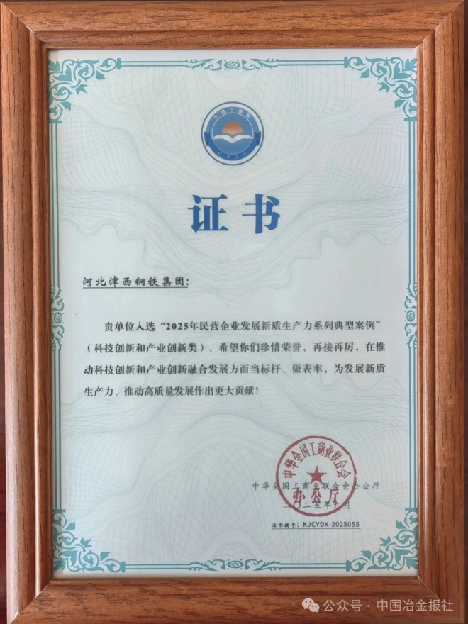 會上,津西集團《強鏈延鏈補鏈,產(chǎn)業(yè)創(chuàng)新賦能傳統(tǒng)產(chǎn)業(yè)高質(zhì)量發(fā)展》案例,入選全國工商聯(lián)“2025年民營企業(yè)發(fā)展新質(zhì)生產(chǎn)力系列典型案例”(科技創(chuàng)新和產(chǎn)業(yè)創(chuàng)新類),全國鋼鐵行業(yè)民營企業(yè)僅此一家入選。