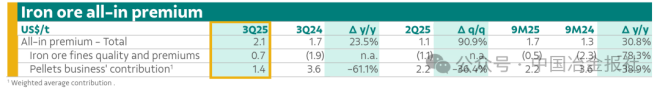 2025年第三季度,鐵礦石產(chǎn)量總計(jì)9440萬噸,同比增長340萬噸,增幅為4%,這得益于S11D礦區(qū)創(chuàng)下季度產(chǎn)量新高,以及重點(diǎn)項(xiàng)目持續(xù)達(dá)產(chǎn)。鐵礦石銷量達(dá)到8600萬噸,同比增長420萬噸,增幅為5%。價(jià)格實(shí)現(xiàn)同時(shí)改善,主要得益于鐵礦石粉礦溢價(jià)增長(環(huán)比增長1.8美元/噸)。球團(tuán)產(chǎn)量總計(jì)800萬噸,同比減少240萬噸,減幅為23%,反映出市場(chǎng)狀況。