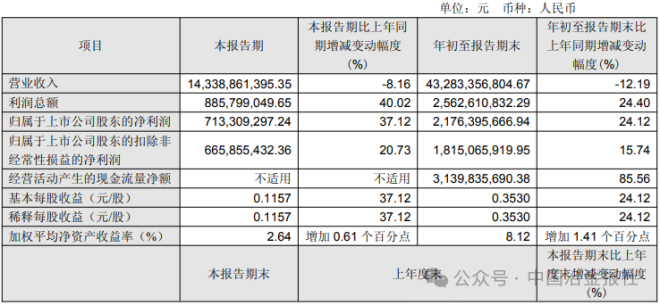 《報告》數據顯示,2025年1-9月,南京鋼鐵股份有限公司實現營業收入432.83億元,同比下降12.19%;實現歸屬于上市公司股東的凈利潤21.76億元,同比增長24.12%;加權平均凈資產收益率8.12%,同比增加1.41個百分點。截至報告期末,公司總資產為701.28億元,比上年度末增長1.48%;歸屬于上市公司股東的所有者權益269.62億元,比上年度末增長3.59%。