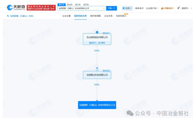 股權全景穿透圖顯示,該公司由寶鋼管業科技有限公司全資持股,后者為寶鋼股份全資子公司。