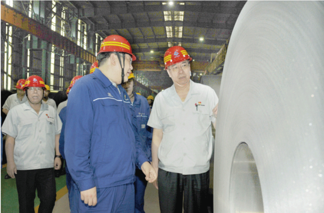 圖為本鋼集團黨委書記、董事長楊維在板材冷軋總廠硅鋼生產線現場調研。