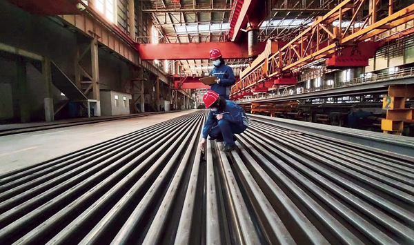 河鋼邯鋼大型軋鋼廠技術人員正在檢查將要出廠的重軌產品質量。 (本報記者 吳兆軍 攝)