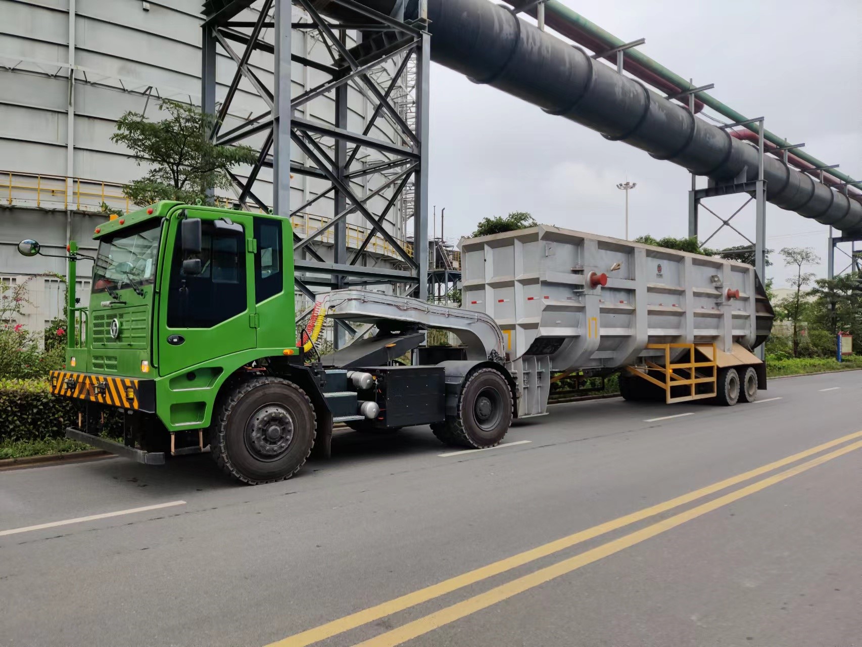 該項目訂制“新能源”料槽牽引車10臺和料槽掛車22臺,為國內首創。中冶寶鋼裝備制造板塊“中冶重機”品牌80噸“新能源”料槽車由純電驅牽引車、機械鵝頸及料槽掛車三部分組成?!靶履茉础睜恳噷橐苯痄搹S非標設計,采用剛性焊接車架、純電動驅動、偏置式駕駛室,具有“低碳化、高承載、高效率、轉彎半徑小”等特點。牽引車與料槽采用機械鵝頸及鞍座舉升實現“甩掛功能”,能夠“一車多掛”,較大地提高冶金鋼廠廢鋼運輸效率、降低設備成本和運行成本。4×2鞍座舉升大噸位偏置牽引車最高時速每小時50公里、最大牽引力254千牛、最大牽引質量140噸,具備超級快充能力,最快50分鐘可全部充滿。目前,從廣西盛隆冶金現場空載及重載采集的數據來看,基本符合設計要求。后續,將進一步接受鋼廠的嚴峻考驗。