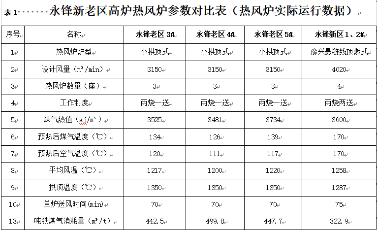 山東永鋒臨港有限公司臨港先進優特鋼產業基地(簡稱永鋒臨港鋼鐵)一期工程1號、2號高爐,各配套使用4座豫興公司優化改進的超低節能懸鏈線頂燃式熱風爐(見表1)。其設計風溫為1250℃,設計拱頂溫度為1350℃,單爐送風60分鐘。兩套熱風爐都在使用單一高爐煤氣,在富氧7%條件下,實現了拱頂溫度1300℃、風溫1250℃穩定輸出,5月份全月噸鐵煤氣消耗322.2立方米。其中,在同等煤氣熱值條件下,比永鋒鋼鐵公司其他3座1080立方米高爐小帽子頂燃式熱風爐噸鐵煤氣消耗462.6立方米月平均節約煤氣140.4立方米,煤氣節約率為30.3%。