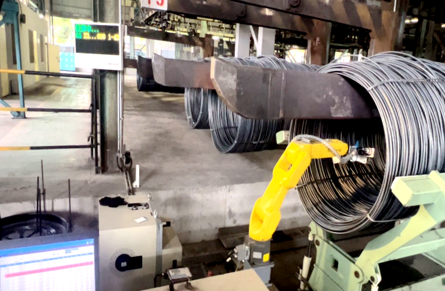 隨著人工智能的快速發(fā)展,智能制造越來越受到重視,機(jī)器人在工業(yè)生產(chǎn)中的應(yīng)用越來越廣泛。中南股份特軋廠高二生產(chǎn)作業(yè)區(qū)自動掛牌機(jī)器人對線材成品進(jìn)行自動掛牌,代替人工完成危險而繁重的工作,可避免安全事故發(fā)生,降低企業(yè)人工成本,提高線材生產(chǎn)效率。