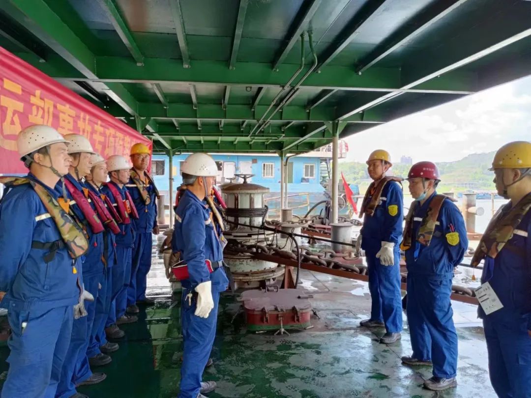 重慶鋼接到通報后第一時間召開了現場緊急辦公會議,布置了一系列防汛工作:實時監控洪峰情況,根據水情變化,控制躉船錨鏈機沉江錨頭、調整岸上鐵牛系緊鋼纜張緊度,及時抬升躉船上移到安全位置,嚴防躉船走錨;躉船短皮帶機出料倉口與陸地皮帶機受料倉口保持一致,保證卸載礦料的順利輸送;強化對離檔、靠檔作業船舶的引導,做好船方人員碼頭集控和專業指揮,嚴禁冒進或違章作業。