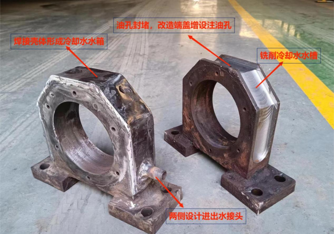 煉鋼廠二連鑄的連鑄輥下線解體,發現軸承損壞的主要原因為高溫造成油脂碳化所致。設備管理部相關技術人員組織備修基地、煉鐵廠相關負責人一同想出了“金點子”。通過在原軸承座周邊加工水槽、引水降溫、改造加油孔,提升冷卻能力,降低軸承溫度,有效防止了油脂碳化,將軸承使用壽命提高了一倍以上。