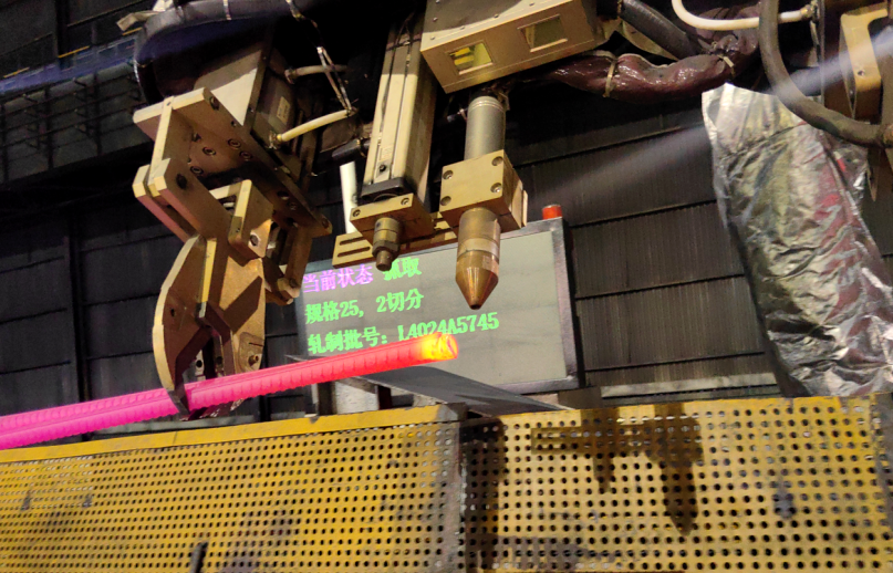 棒三線自動(dòng)取樣機(jī)器人系統(tǒng)采用ABB六軸機(jī)器人、激光掃描、圖像識(shí)別測長及追蹤算法、自動(dòng)控制等技術(shù)。取樣機(jī)器人由六自由度機(jī)械手和伺服控制器組成,能夠靈活調(diào)整姿態(tài)完成取樣作業(yè)。所采用的等離子切割技術(shù)能夠確保對所有規(guī)格的棒材進(jìn)行精確切割,提升取樣的準(zhǔn)確性和實(shí)用性;自動(dòng)取樣機(jī)器人系統(tǒng)會(huì)根據(jù)取樣信號或者取樣時(shí)間設(shè)定,待棒材上到冷床后,機(jī)器視覺系統(tǒng)自動(dòng)識(shí)別定位棒材位置,引導(dǎo)機(jī)器人抓取、剪切實(shí)現(xiàn)取樣,再送至拆分冷卻位完成拆分與冷卻,冷卻后自動(dòng)檢測負(fù)公差,根據(jù)鋼坯號貼標(biāo)留樣,替換人工單一重復(fù)工作,提高作業(yè)效率。棒三線自動(dòng)取樣機(jī)器人工作流程及采樣實(shí)績接入中南鋼鐵機(jī)器人集中管控平臺(tái)進(jìn)行監(jiān)控與管理。