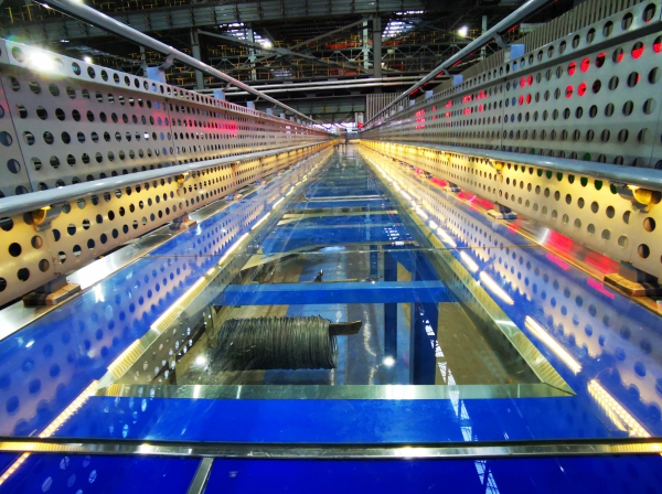 外出旅游,很多人都會(huì)選擇到“網(wǎng)紅地”打卡。比如久負(fù)盛名的婺源彩虹橋、張家界玻璃棧道等。然而就在不久前,該公司軋鋼廠也特別打造了一條“玻璃棧道”,在高速線材PF鏈區(qū)域,游客可以透過(guò)明亮的玻璃,直觀看到腳下運(yùn)轉(zhuǎn)中的PF鏈,以及掛在C型鉤上已經(jīng)打包好準(zhǔn)備入庫(kù)的線材成品。這樣全新的沉浸式體驗(yàn),讓游客在直觀感受鋼鐵企業(yè)火熱、有序的生產(chǎn)氛圍的同時(shí),更增添了工業(yè)旅游的豐富性與新奇感。