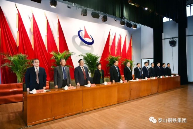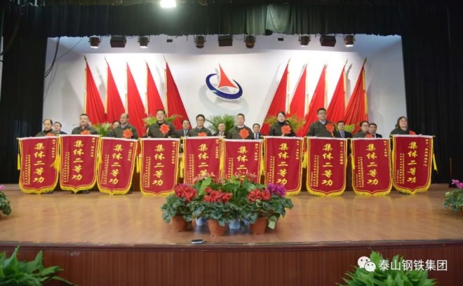 今日的中心會堂氣氛莊重熱烈。主席臺上,鮮花傲然綻放,綠植青翠欲滴,后幕正中是熠熠生輝的泰山鋼鐵集團廠徽,10面紅旗分列兩側。最上方,“山東泰山鋼鐵集團有限公司2021年度總結表彰大會”的會標在燈光的輝映下格外醒目。會場后方懸掛標語:“以黨的十九大精神為指引,以經濟效益為中心,堅持綠色低碳和高質量發展,抓好技術研發,抓好市場開拓,抓好產業升級,精益求精,聚精會神,將‘學習、實踐、創新、提高’活動推向深入。”