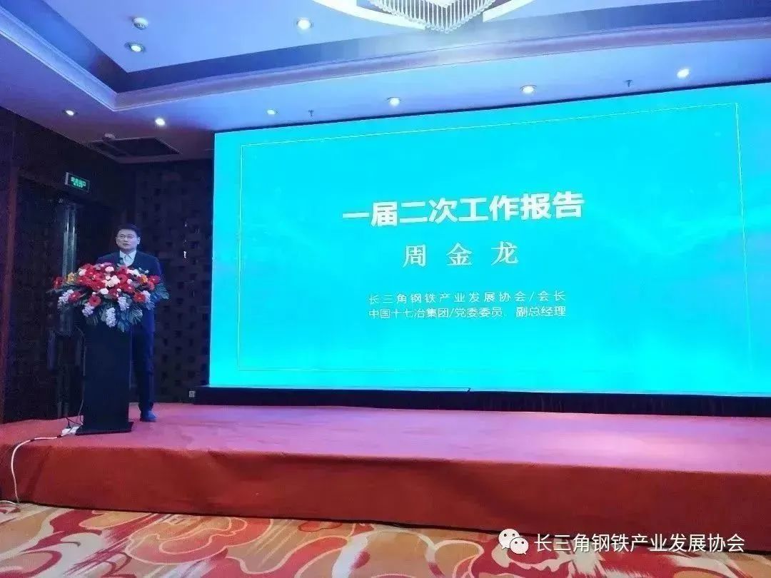 長三角鋼鐵產(chǎn)業(yè)發(fā)展協(xié)會一屆二次理事會會長、中國十七冶集團黨委常委/副總經(jīng)理周金龍作協(xié)會年度工作報告。