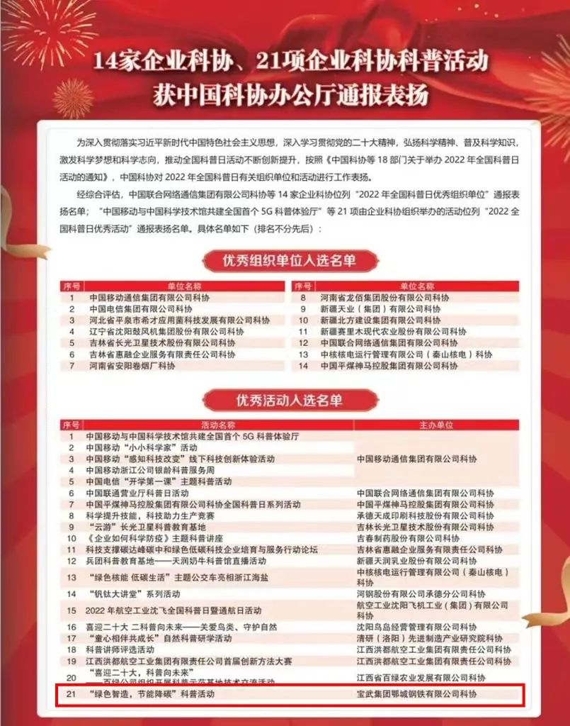 近日獲悉,在中國科協(xié)等18部門舉辦的2022年全國科普日活動中,經(jīng)綜合評估,鄂城鋼鐵科協(xié)“‘綠色智造,節(jié)能降碳’科普活動”入選“2022全國科普日優(yōu)秀活動”通報表揚(yáng)名單。