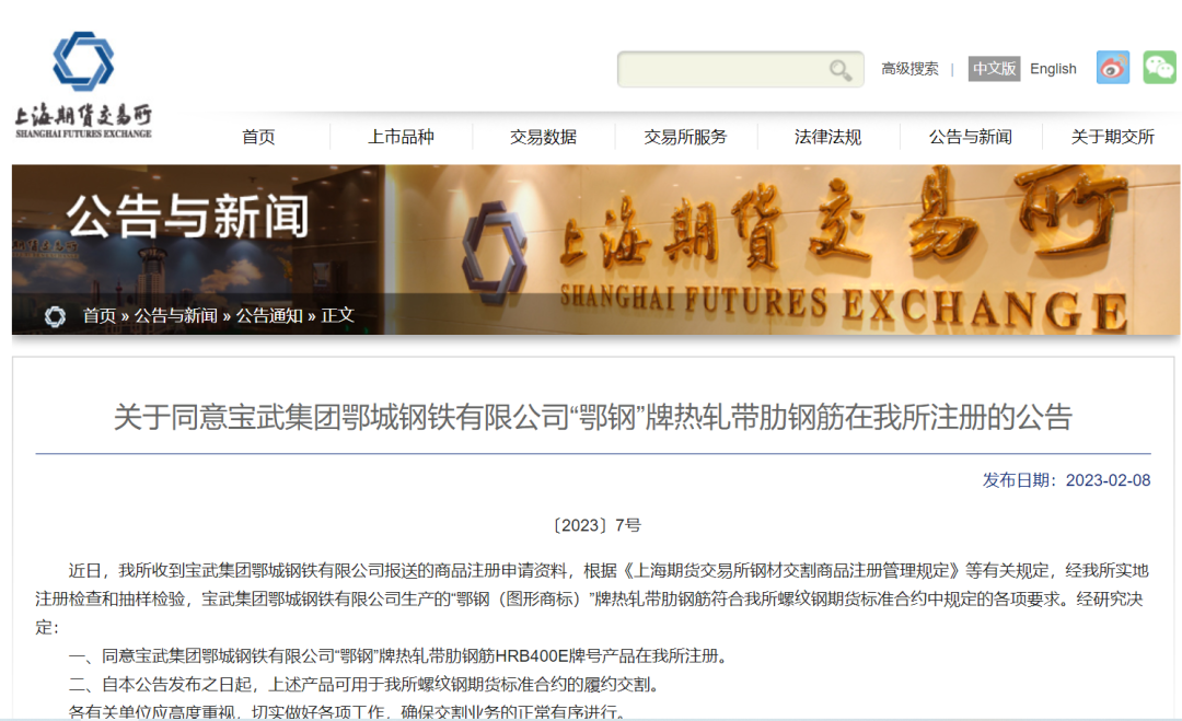 2月8日,上海期貨交易所(以下簡稱上期所)發布公告,同意寶武集團鄂城鋼鐵有限公司“鄂鋼”牌熱軋帶肋鋼筋注冊上期所交割品牌。這是自2018年以后,時隔4年“鄂鋼”牌熱軋帶肋鋼筋再次恢復成為上期所交割品牌?!?span style="">鄂鋼”牌的成功注冊,標志著公司螺紋鋼產品進入高標準高質量行列,工藝技術、管理和服務體系能力均達到國內一流水平。