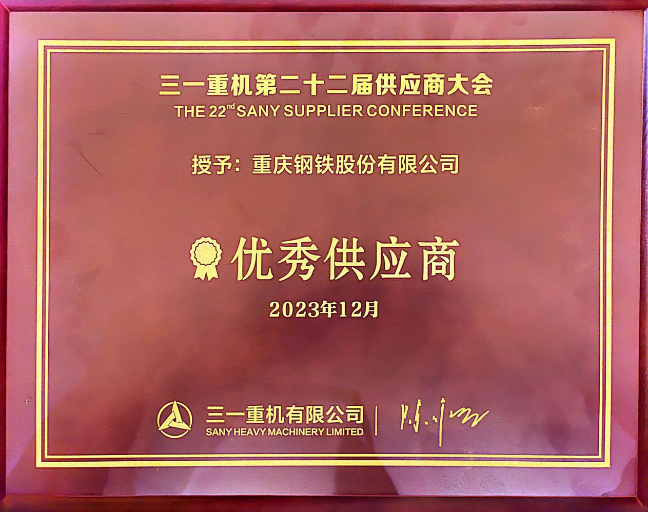 2021年,三一重機(重慶)有限公司投產,重慶鋼鐵憑借堅實的中厚板生產實力、優(yōu)秀的中厚板產品質量及區(qū)位優(yōu)勢,在三一重機(重慶)有限公司的供應商市場中脫穎而出,成為三一重機(重慶)基地優(yōu)秀的合作伙伴。2023年12月,三一重機(重慶)有限公司在江蘇昆山召開了2023年度“三一重機第22屆供應商大會”,重慶鋼鐵憑借優(yōu)秀、高質量的產品和服務,以及良好的品牌口碑和信譽,榮獲三一重機“優(yōu)秀供應商”稱號。
