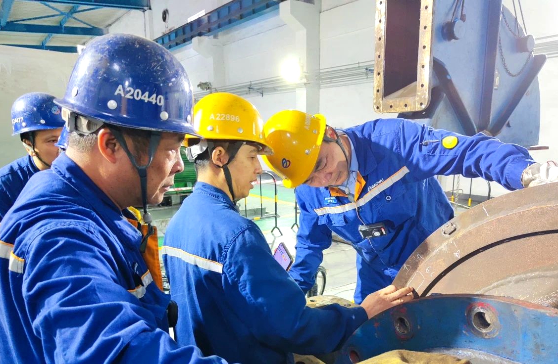 2023年10月,能環(huán)部維檢作業(yè)區(qū)開始緊鑼密鼓四柜區(qū)1號(hào)轉(zhuǎn)爐風(fēng)機(jī)定修。作為本區(qū)域旋轉(zhuǎn)設(shè)備協(xié)力回歸后的首次定修工作,在線做動(dòng)平衡過程中風(fēng)機(jī)水平振動(dòng)值偏高讓工作人員感覺遇到了不小的挑戰(zhàn)。工作人員不斷摸索如何解決風(fēng)機(jī)振動(dòng)值偏大的辦法。8位師傅一次又一次地將一噸多的風(fēng)筒上蓋拆除和回裝試機(jī),通過排除法,手拿銼刀一前一后地打磨上蓋與葉輪連接處、根據(jù)測(cè)試儀的數(shù)據(jù),“9°處加19克”,“301°處加68克”,切割合適重量的鋼塊并焊接至葉輪對(duì)應(yīng)角度處為葉輪平衡配重。師傅們連續(xù)兩天忙至深夜,第三天上午,設(shè)備試機(jī)至轉(zhuǎn)速為2500轉(zhuǎn)每分鐘時(shí),振動(dòng)測(cè)試儀的讀數(shù)終于從第一次試機(jī)的20以上下降至0.7,滿足設(shè)備運(yùn)行的振動(dòng)值1.0以下的要求,師傅們嚴(yán)肅的眉間終于舒展開來露出笑容。作業(yè)區(qū)協(xié)力回歸后,雖然大家工作量增加了,但每年能為公司節(jié)省110萬元的委外成本。此次通過使用幾千元的清洗劑、鐵塊等耗材,完成了價(jià)值20萬元的設(shè)備檢修工作。