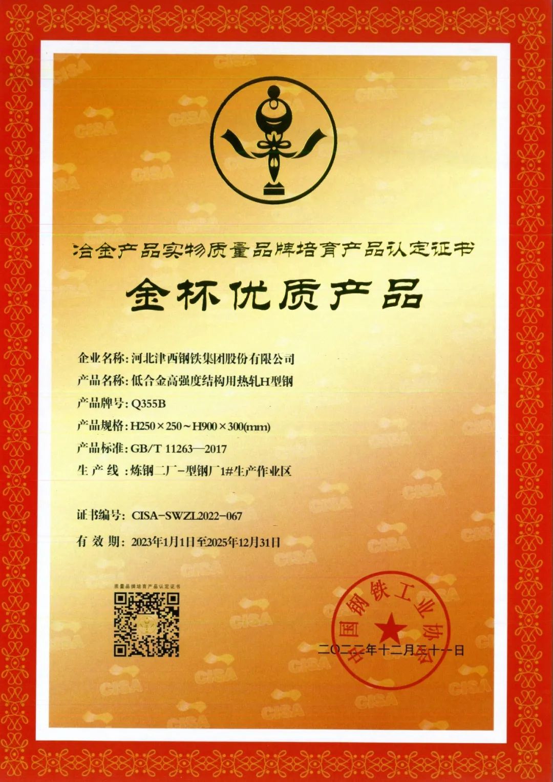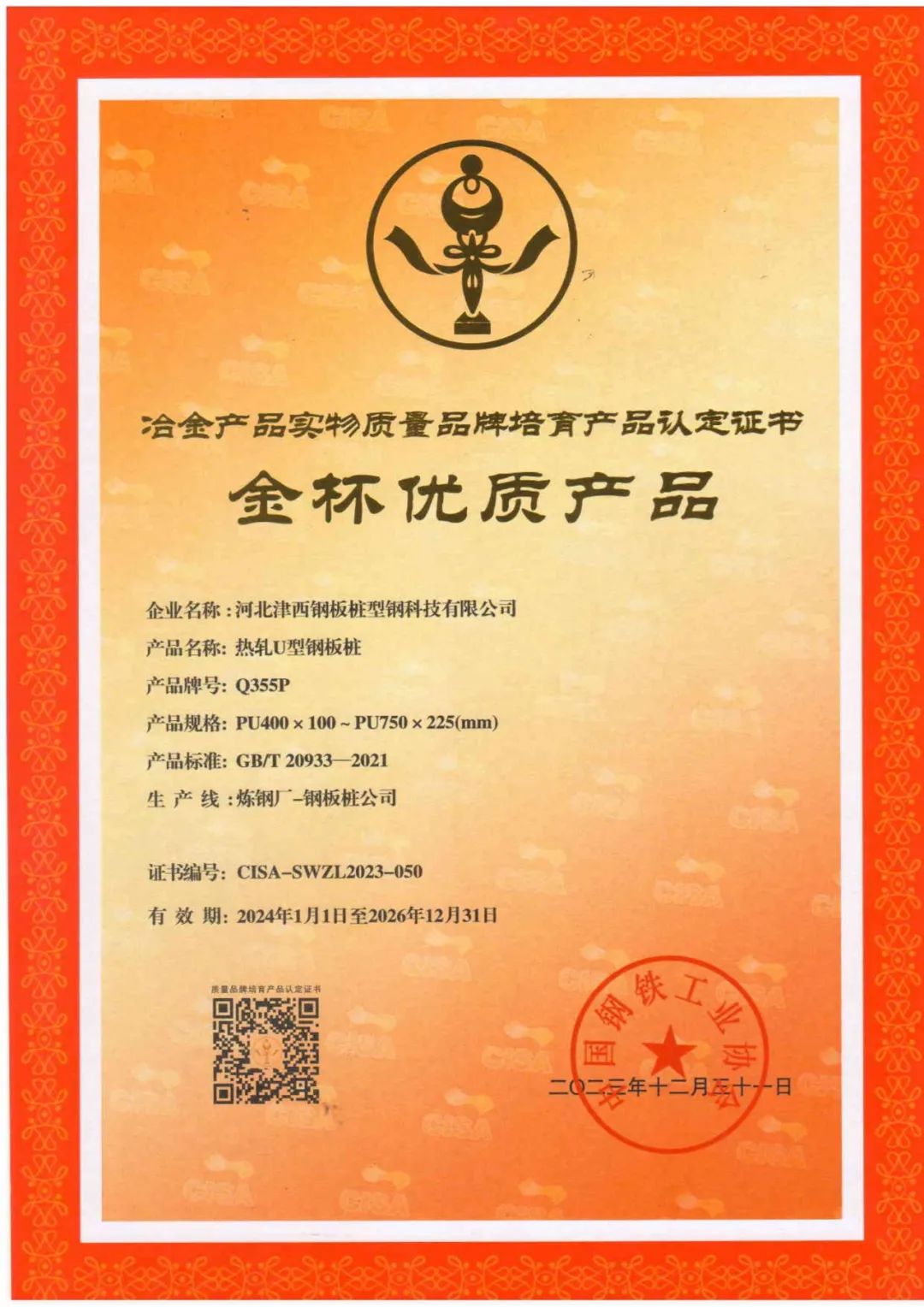 今年3月上旬,津西股份收到來自中鋼協的證書,熱軋U型鋼板樁被冠名為“金杯優質產品”。這是繼電氣化鐵路接觸網支柱用熱軋H型鋼、低合金高強度結構用熱軋H型鋼之后,津西型鋼產品第三次獲此殊榮。