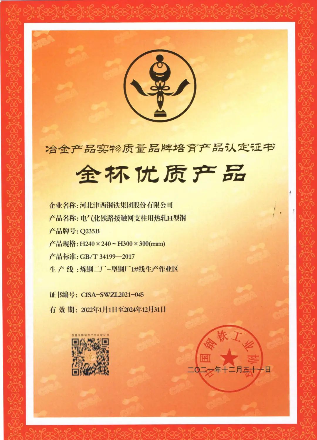 目前,津西型鋼產品已形成H型鋼、鋼板樁、高鐵線桿、工槽角鋼等134個系列、372種規格,擁有耐低溫型鋼、耐候型鋼、高強度型鋼等30余種高端產品,獲得中國船級社工廠認證,尤其抗擊零下30℃歐美標準Z型鋼板樁打破歐美技術壟斷。累計參與起草并實施的標準制/修訂達90余項,獲得日標、韓標、歐標等9個國家的11種產品認證和6個管理體系認證。津西高鐵線桿,涵蓋所有常用規格,廣泛應用于京滬線、京廣線、哈大線、京張線等90余條高鐵工程,國內市場占有率達90%以上。津西H型鋼產品獲得“中國H型鋼市場品質信譽第一品牌”“中國H型鋼市場用戶滿意首選品牌”“中國卓越鋼鐵企業品牌”等稱號,并連續多年被評為“全國用戶滿意產品”。