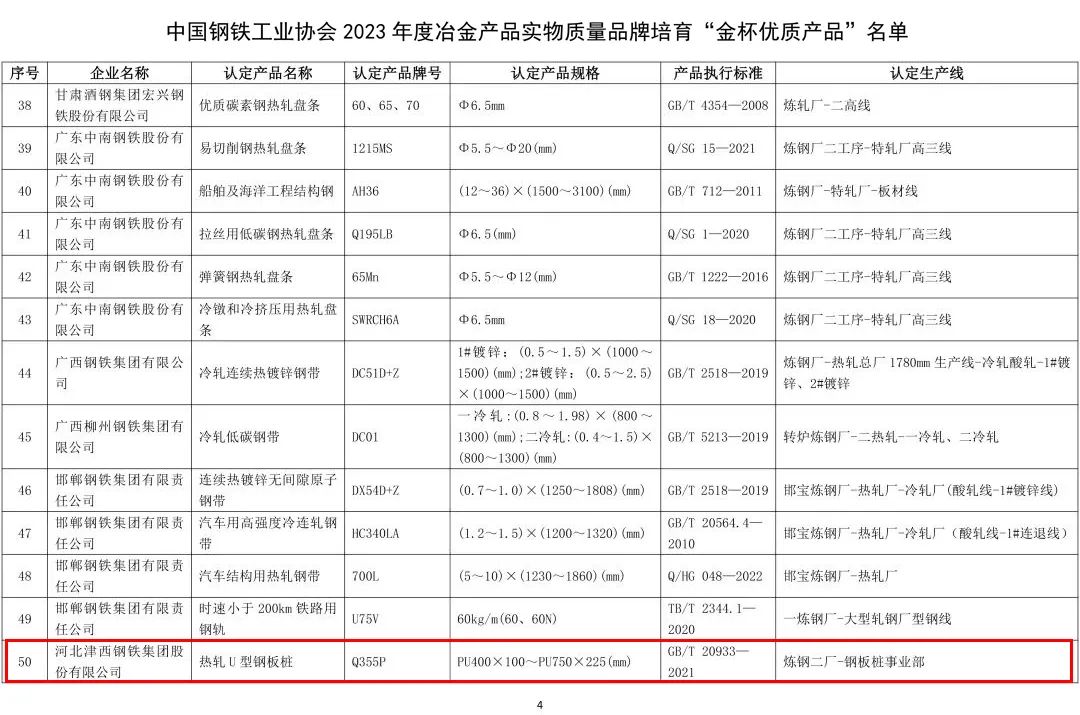 “在冶金產品實物質量品牌培育活動中,津西熱軋U型鋼板樁被冠名為‘金杯優質產品’,作為冶金行業非常有影響力的質量獎,這是對津西型鋼產品的認可,對進一步提升津西型鋼產品市場競爭力和打造津西品牌具有重要作用”,相關申報負責人說。