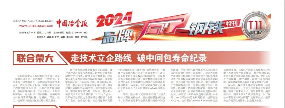 聯合榮大堅定地走技術立企的路線,通過多種途徑夯實技術基礎,研發行業領先的耐材產品與技術,取得了驕人的成果。聯合榮大牽頭及參與制定的標準有24項,其中國家標準6項、行業標準12項、團體標準6項。目前,聯合榮大已申請各類專利219項,擁有材料與裝備授權專利137項,其中發明專利50項、實用新型專利73項。2020年,聯合榮大被認定為北京市專精特新“小巨人”企業,次年被工信部認定為國家級專精特新“小巨人”企業。在冶金行業,該公司還多次獲得“中國鋼鐵技術與服務供應商品牌企業”“鋼鐵產業鏈綠色標桿企業”等榮譽稱號。該公司所擁有的長壽命板坯中間包技術、環保型水基大面自流料技術、高爐整體快速大修技術在冶金行業分別被評為鋼鐵產業鏈綠色低碳好技術。2022年,該公司被中國耐火材料行業協會評為“企業信用評價AAA級信用企業”。