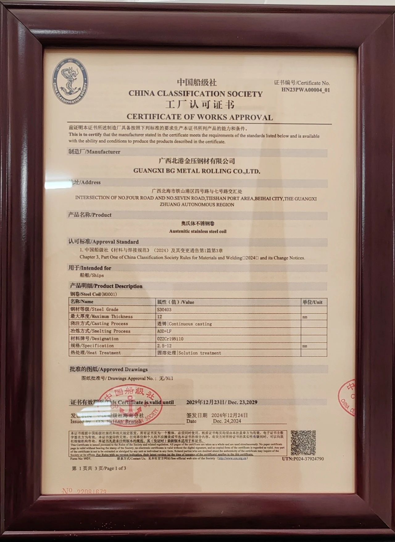 中國船級社認可證書作為企業進入船舶領域、海上設施及相關工業的官方通行證,具有極高的專業性與權威性。此次工廠認可證書的獲得,意味著北港金壓鋼材公司的生產條件和制造能力已經通過了中國船級社的嚴格審查,其304不銹鋼產品完全滿足船級用鋼的要求。