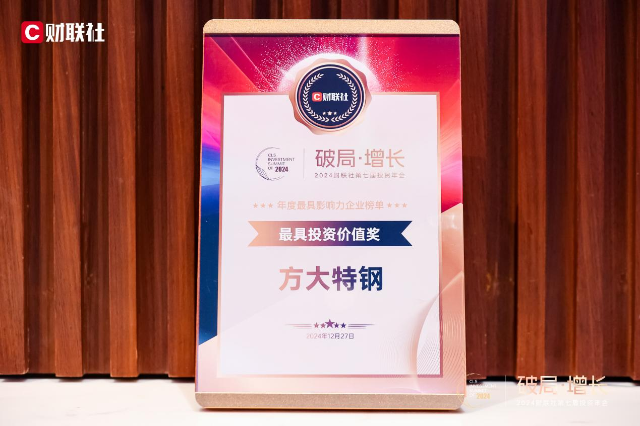 2024年12月27日,財聯社第七屆投資年會在上海舉行,現場揭曉2024年度資本市場最具價值影響力榜單,其中,方大特鋼榮膺2024年度“最具投資價值獎”。這一榮譽不僅彰顯了方大特鋼在資本市場上的卓越表現,也體現了行業和社會對其投資價值的高度認可。