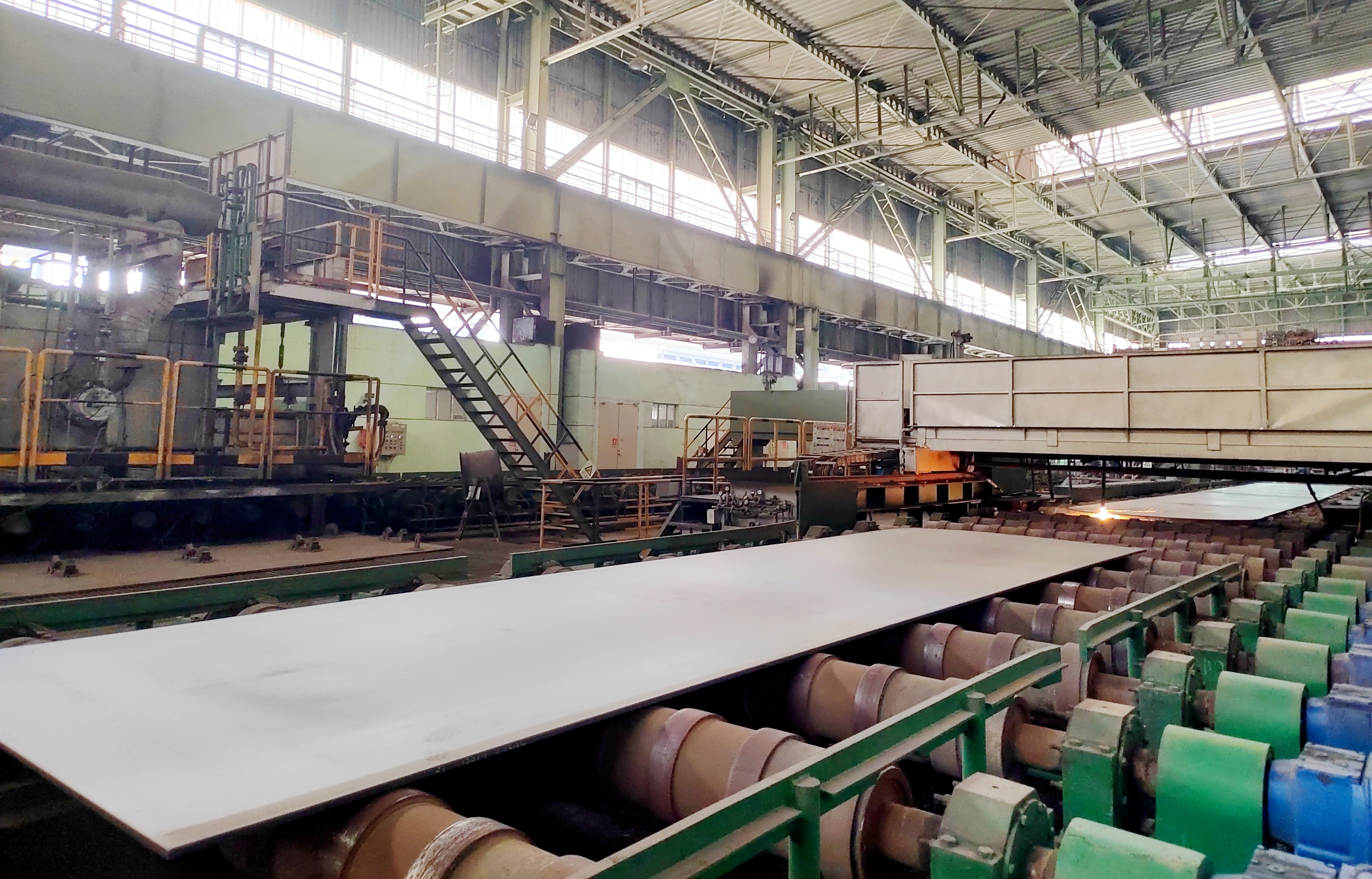 為進一步挖掘現場降本潛力,板材車間的黨員骨干們經過現場調研發現,厚度在80mm以上的鋼板常規入爐流程存在保溫時間長、空間利用率低等問題。經過反復試驗與論證,團隊大膽創新,對厚度大于60mm且長度小于22m的鋼板,采用在線不切割,利用超長掛梁轉運,采用長板加短板搭配入爐的新模式,增加入爐鋼板數量。待鋼板完成熱處理后再進行切割,這一舉措使得熱處理回火鋼板平均班產量躍升至120噸/班,不僅更好保障了客戶的訂單按期交貨,同時也減少了爐內煤氣、氮氣等能源損耗。
