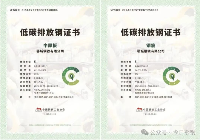 鄂鋼積極構建全流程綠色制造體系、碳管理體系,成功創建國家“綠色工廠”“高新技術企業”,通過工藝技術創新和全流程精益碳管理,噸鋼碳排放強度優于行業平均水平,全工序展現讓能耗數據“說話”的低碳智慧,厚板、鋼筋等產線榮獲中鋼協碳效等級E級認證。