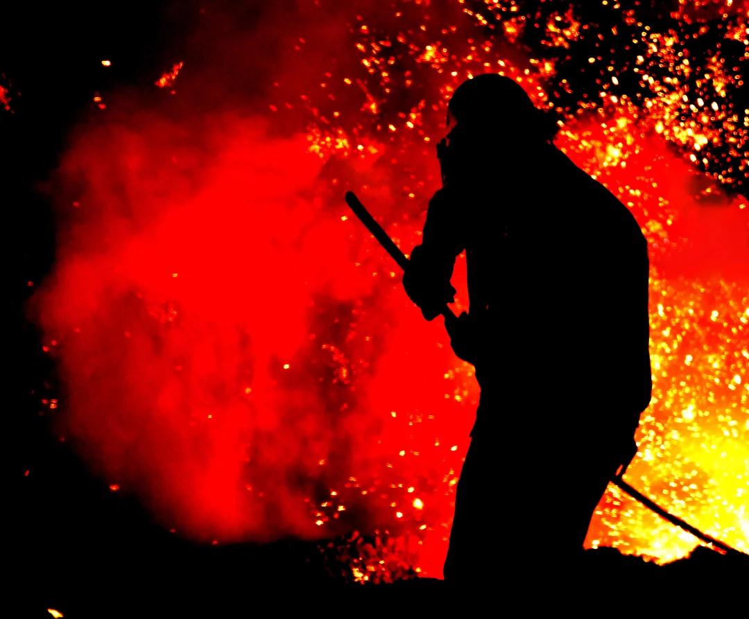 10:28,在4號高爐東邊鐵口,通紅炙熱的鐵流正奔涌而出,眼前紅光閃閃、火龍飛舞,1400多度的鐵水高溫烘出來的滾燙熱風,令人難以接近。而在離鐵口僅1米多的地方,爐前工楊建中無懼高溫“烤”驗,正在緊張作業,流淌的汗水已然濕透了他的后背,真是好一幅“高爐烈火煉丹心,鋼筋鐵骨戰火龍”的沸騰畫面!
