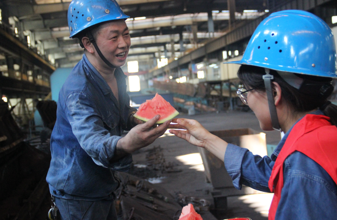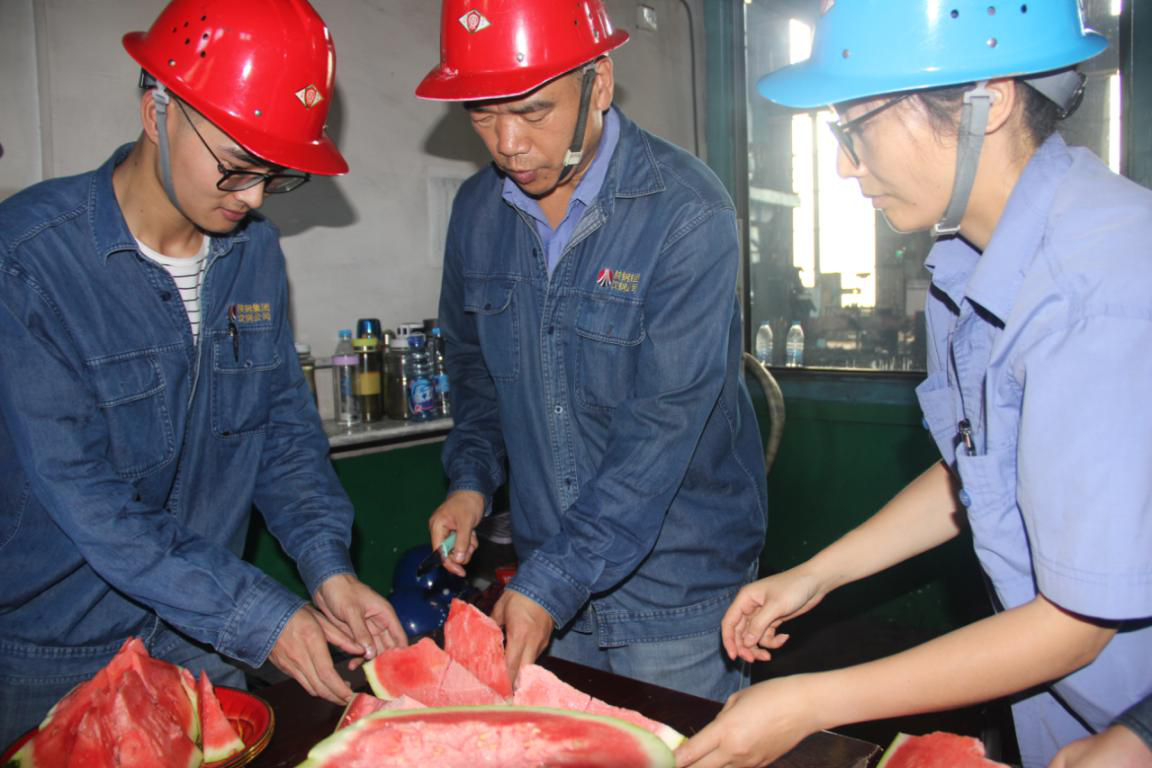 檢修當天,軋鋼廠工會主席劉轉運重復最多的話就是:“這些娃娃太辛苦了,這么熱的天搶修粗軋減速機,需要堅持奮戰20個小時,這是真正意義上的戰高溫、斗酷暑,年輕一代用實際行動顛覆了我的看法,我很感動。”簡單樸實的一段話,不僅流露出領導對員工的關懷,更飽含著家人一樣的關愛。下午四點,軋鋼廠工會主席劉轉運和青年志愿者為堅守一線搶修作業的干部員工切西瓜。