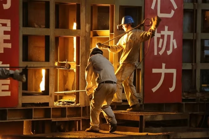 沒有安靜的作業條件,轟鳴的機器聲是他們耳邊最動聽的音弦;沒有習習的涼風,飛舞的鋼花是陪伴他們最忠實的伙伴;他們就是連鑄中包工,也是煉鋼廠最火熱、最辛苦的崗位。一年四季穿著加厚的秋衣秋褲,全身被厚重的防護服、防護靴包裹的嚴嚴實實,在60℃的工作場所、在1500°C多的鋼水邊堅守,體驗著火烤前胸熱、風吹后背涼的冰火兩重天。經過連鑄平臺時,臺上組長張旭正在戴套管,拉鋼工將結晶器液面降至距水口15-20cm,,張旭將烘烤好的套管下部放入結晶器口,上口端平先貼近鋼流,平穩迅速的用上口接住鋼流后與滑板下口結合,調整套管豎直插入,一時間鋼花四濺,偶爾有幾只調皮的鋼花從袖口、脖子鉆入他的衣服,短短十幾秒就戴好了一根套管,8個流的套管戴下來他早已被熱浪烘烤的臉上汗珠似雨下,后背留下一道道鹽漬。“一個班下來工作服要濕好幾茬,幸虧車間準備的冰鎮綠豆湯,一杯下肚讓人瞬間戰斗力滿滿。”正說著他不顧滿臉的汗水和油污,拿起水杯一杯綠豆湯一飲而盡。