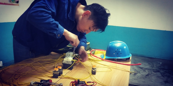 按照題目要求,先畫出主回路電氣原理圖、控制回路電氣原理圖、分析工作原理、選擇電氣元件及主回路電纜的型號和容量(帶運行指示燈),再根據現場提供的電氣元件進行接線并進行通電試驗,限時90分鐘。參加本次實踐考試的有36人,分四場進行,今天是第一場,八個人。這邊奮筆疾書,畫電路設計圖、分析原理。那邊按照圖紙已經開始接線,手指捏緊電線頭,用線鉗麻利的分線,用螺絲刀緊線,接好一個啟動開關,看一下圖紙,再接下一組元器件……他們細心認真的樣子與平時大大咧咧的樣子判若兩人??此D爐電工劉軒,凝神聚力,目光專注在自己的考題上,認真完成他的考試作品。